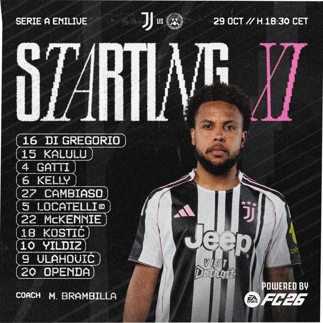 尤文首发:16-迪格雷戈里奥、15-卡卢卢、4-费代里科-加蒂、6-劳埃德-凯利、27-安德烈亚-坎比亚索、5-洛卡特利、22-麦肯尼、18-科斯蒂奇、10-凯南-伊尔迪兹、9-弗拉霍维奇、20-奥蓬达